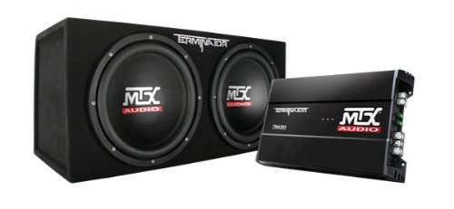 MTX created the Terminator series amplified sub system with one thing in mind: to terminate the competition who make inferior quality loaded woofer systems. They did a great job with this system as they thoroughly tested their TN250/1 Class D monoblock amplifier with the two Terminator 12" subwoofers and matched them in the perfect enclosure. Because they built the enclosure to perfect specifications for the subs and amp combo, they allow you to leave your fear of a bad system at the door and instead enjoy hours of clean, loud bass at an unbeatable price. TNE212D Dual Loaded Subwoofer Enclosure Features: 2 12" Terminator Series Subwoofers Included Power Handling: Peak: 1200 watts per pair / 600 watts each sub RMS: 400 watts per pair / 200 watts each sub 2" Aluminum single 4 ohms voice coil Rubber Surround Polypropylene Cone MTX Audio Logo on Dustcap 48oz. Magnet Frequency response: 37-150 Hz Enclosure Features: Dual 12" Sealed Sub Enclosure 5/8" MDF Solid Contruction Durable Black Carpeting Terminator Logo Embroidered into Carpet Front Dimensions: 14"H x 29-1/2"W x 13-1/2"D1 x 11"D2 TN250/1 Monoblock Amplifier Features: Terminator Series Class D Monoblock Car Amplifier RMS Power Rating: 2 ohms: 200 watts x 1 chan. Max power output: 400 watts x 1 chan. LED power and protection indicators Selectable bass boost (0, 6, 12 dB at 40 Hz) Mono gain control Smart engage auto turn-on circuitry Built-in adaptive cooling fans Fixed low-pass filter (85 Hz, 18 dB/octave) CEA-2006 compliant amplifier Frequency response: 20-85 Hz Dimensions: 13-1/16"L x 10-3/16"W x 2-1/4"H 4-gauge power and ground leads recommended.